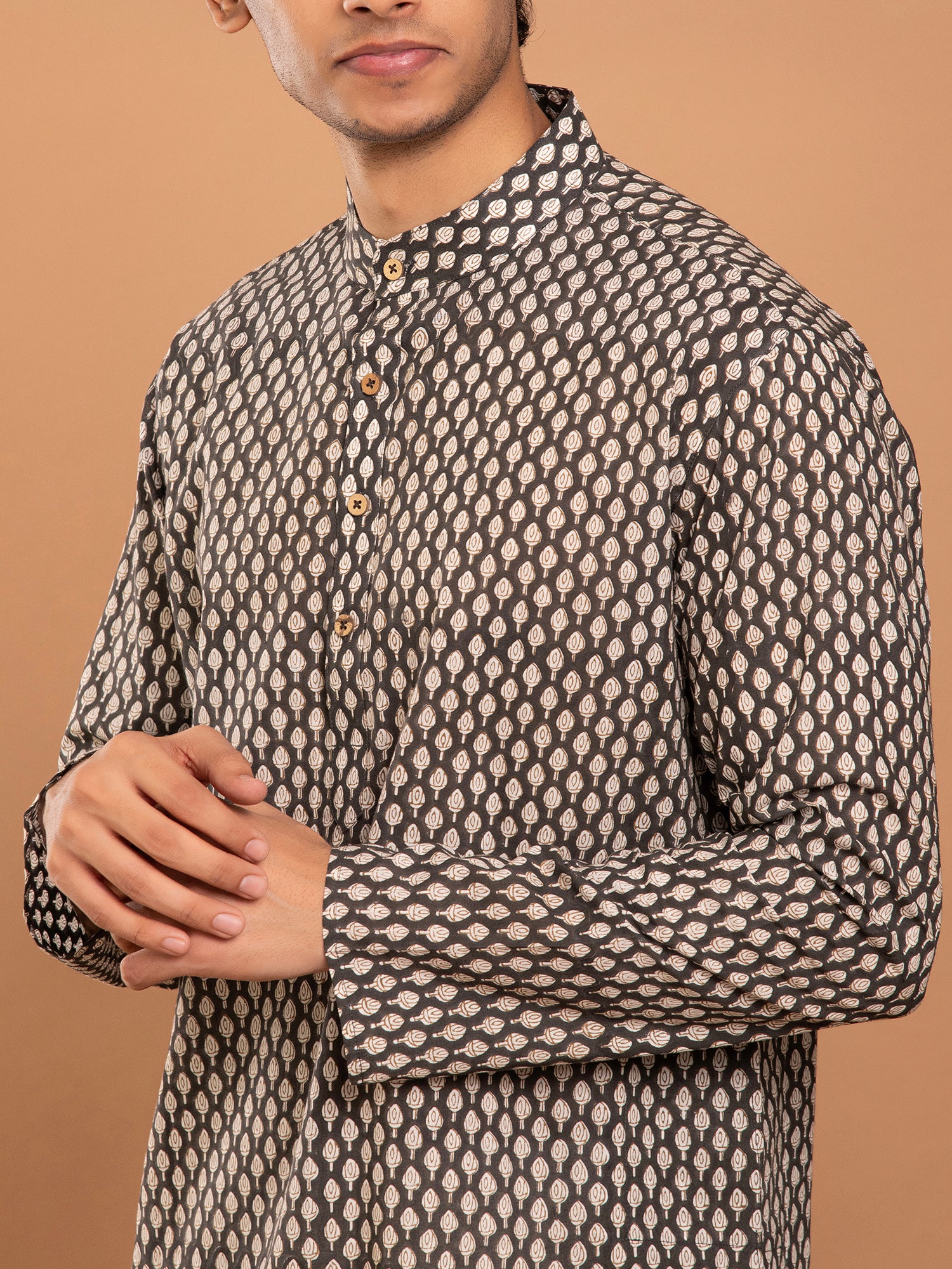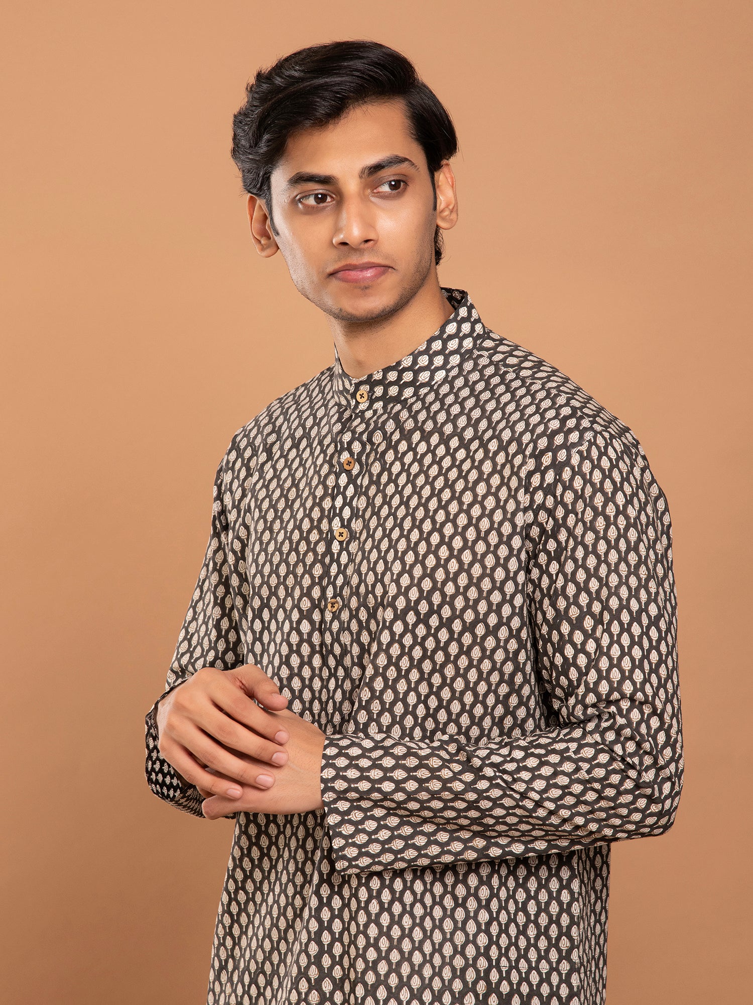 The Aaheli "Abhay Hand Block Printed Cotton Kurta-Pant Set" offers a blend of traditional craftsmanship, comfort, and style. Crafted from high-quality black fabric, this kurta features a mesmerizing block print that adds depth and intrigue to its design. It's suitable for various occasions, ranging from casual outings to festive celebrations, and provides wearers with a distinctive and elegant look.