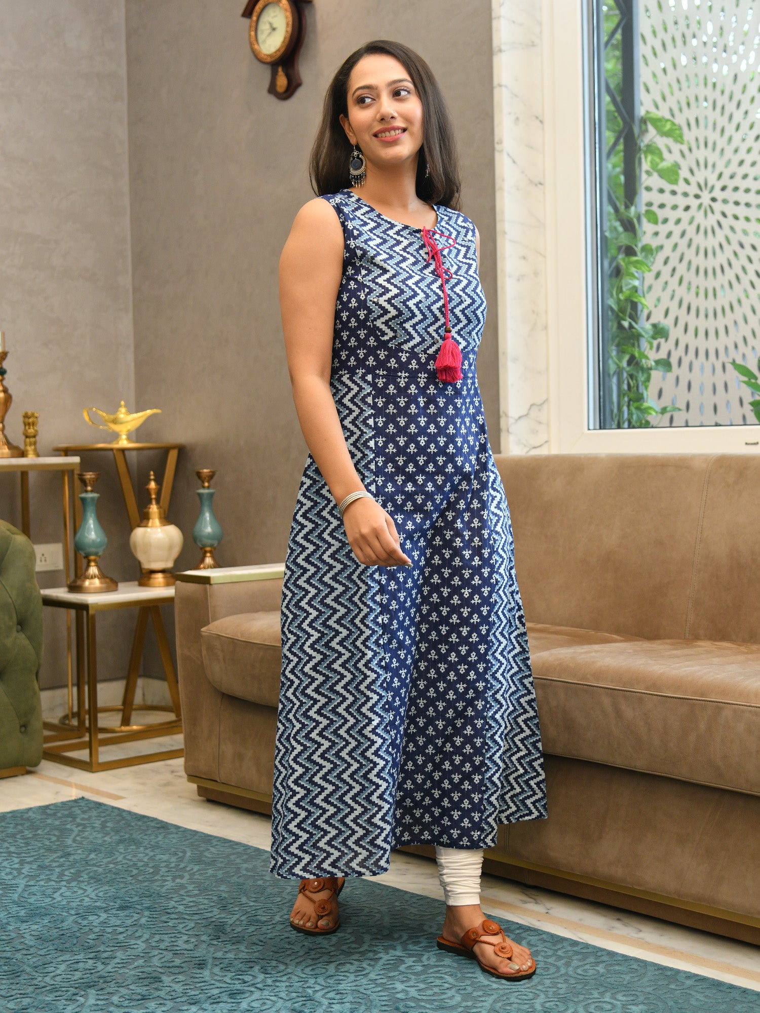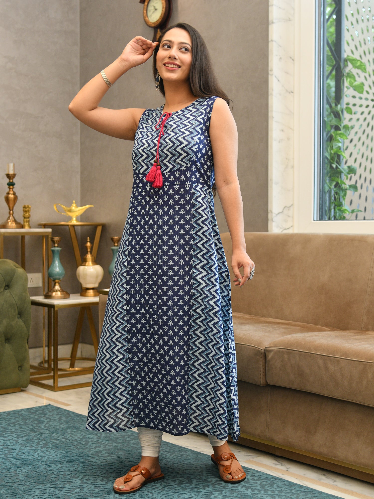 Navy blue printed sleeveless paneled A-line kurta. Style this kurta with different bottoms & chunky jewelry to complete the look.