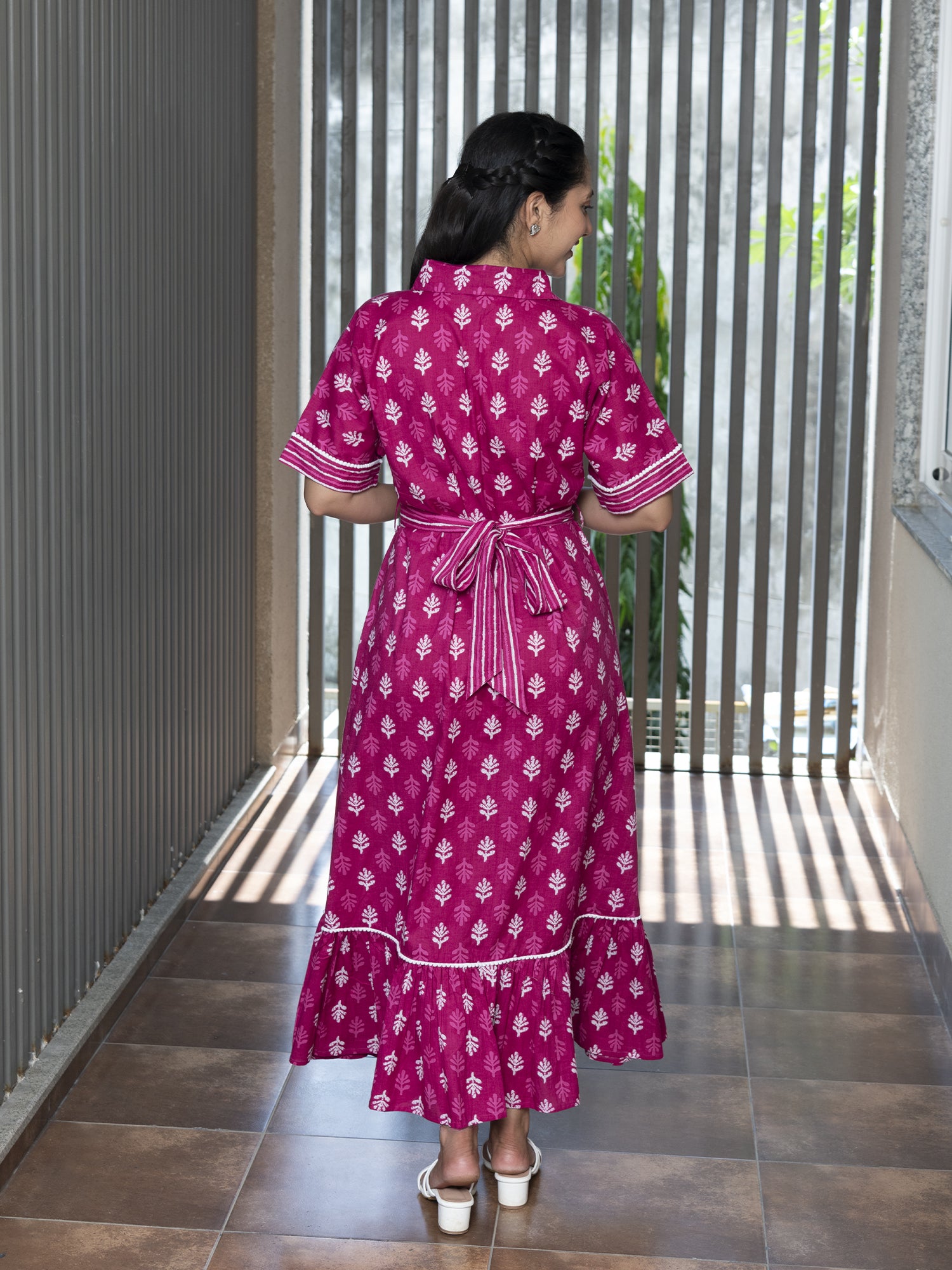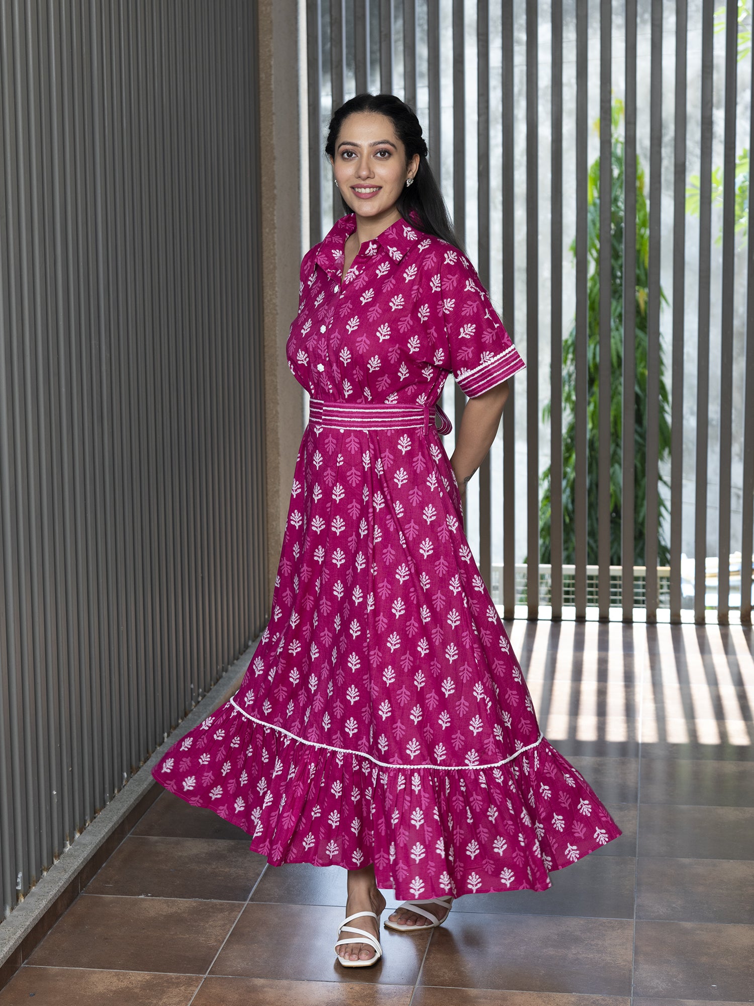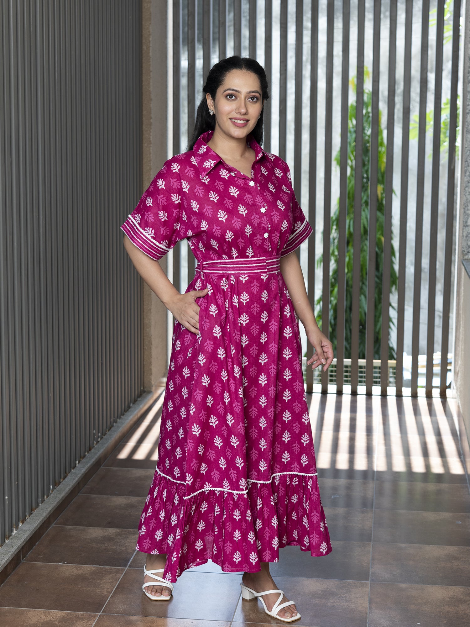 Introducing the Arasi Fuchsia Printed Cotton Maxi Dress – a stunning fusion of comfort and style. The extended kimono sleeves add a touch of sophistication, while a detachable fabric belt at the waist allows for personalized styling. The dress is designed with a shirt collar, offering a chic and polished look. Embrace the vibrant fuchsia print and make a statement with this versatile maxi dress that seamlessly transitions, ensuring you stand out with every step.
