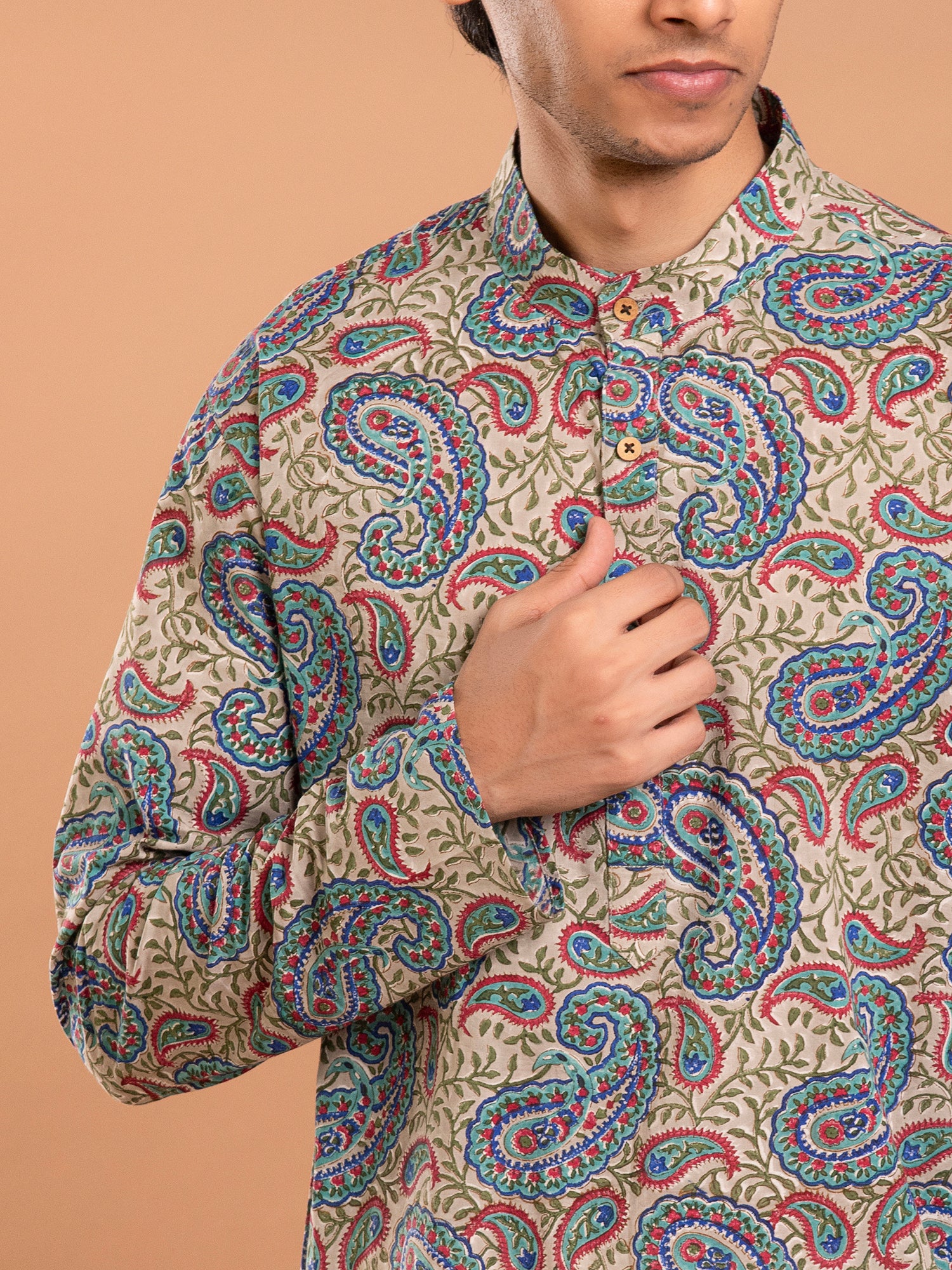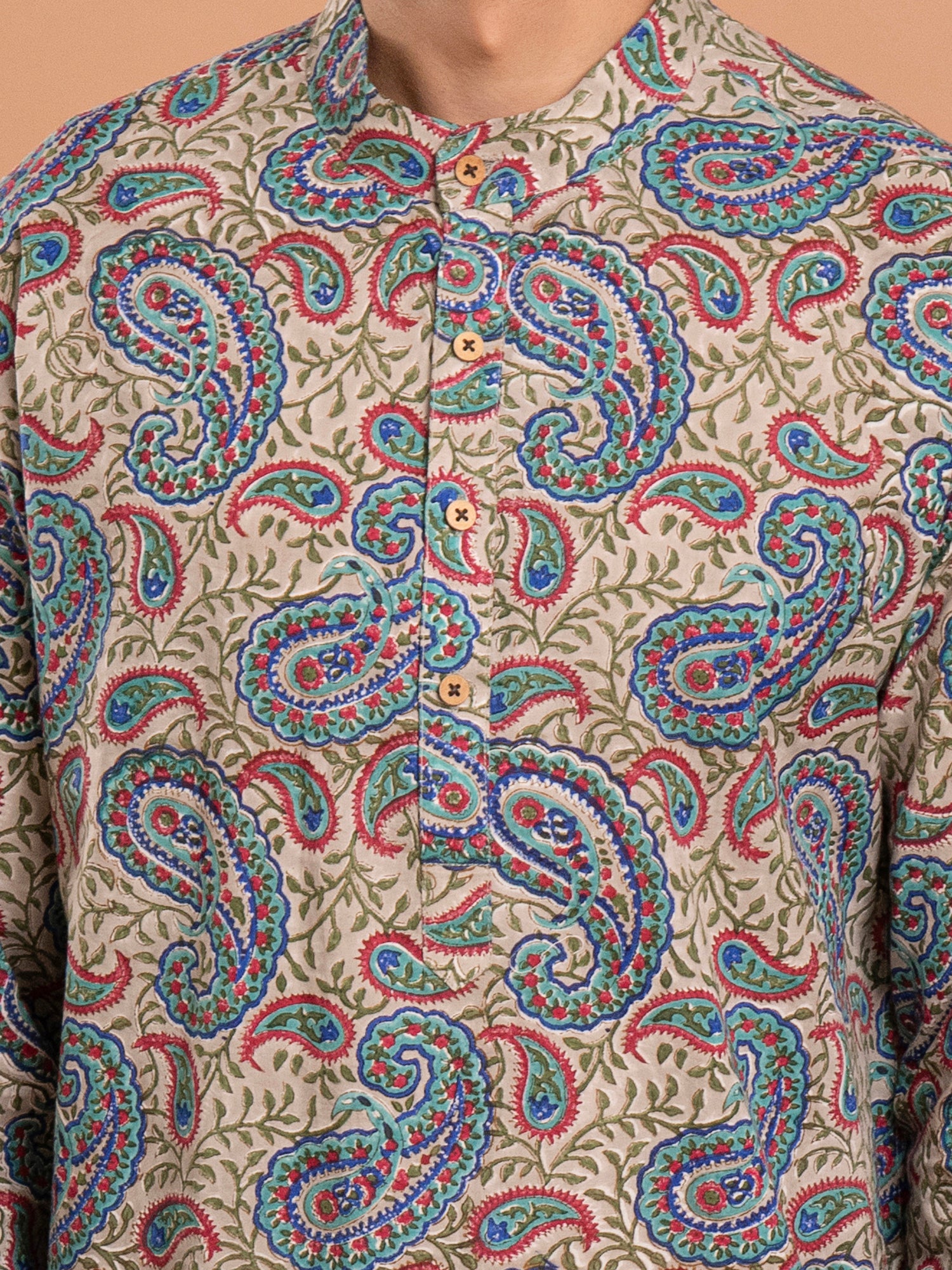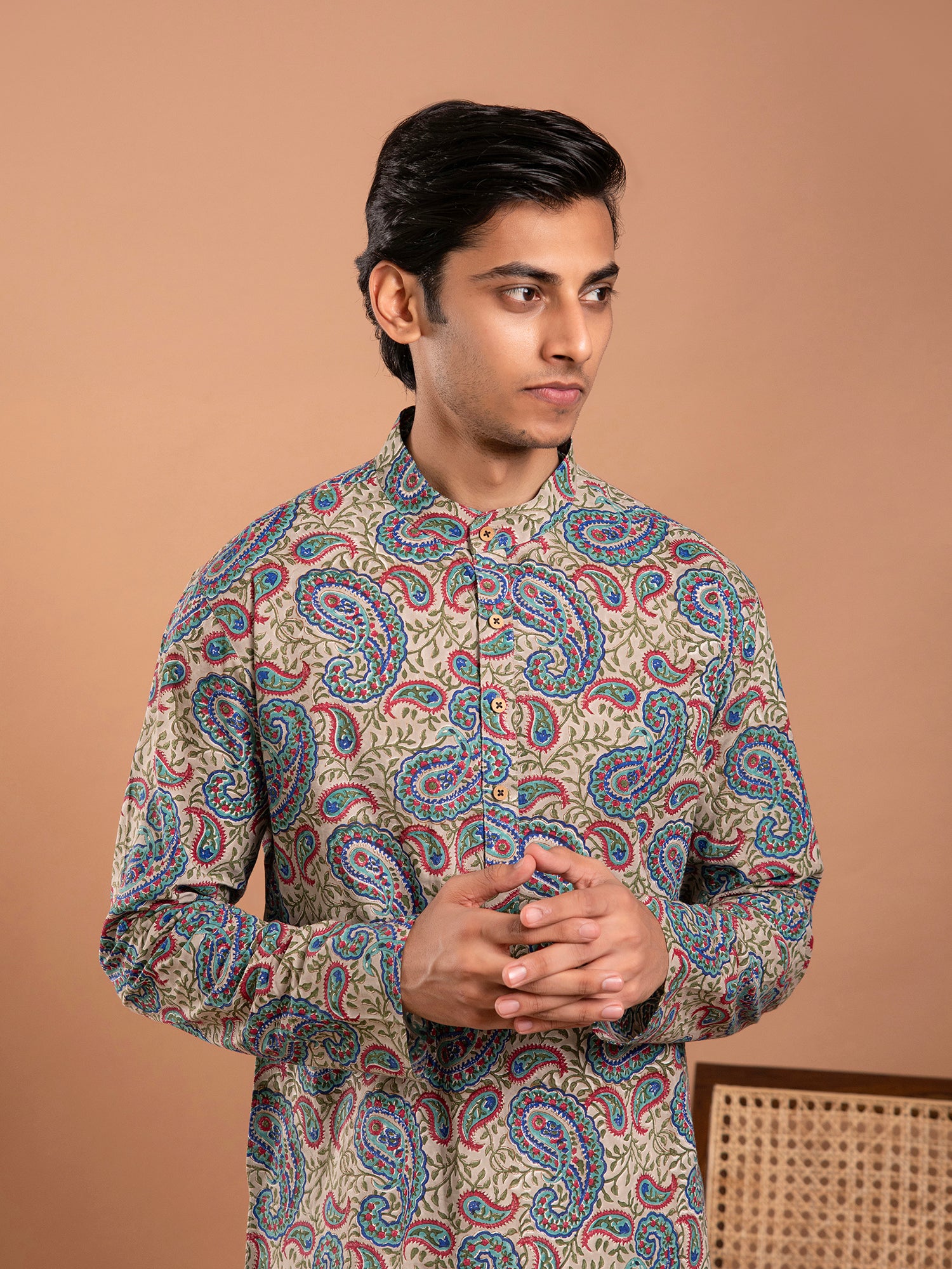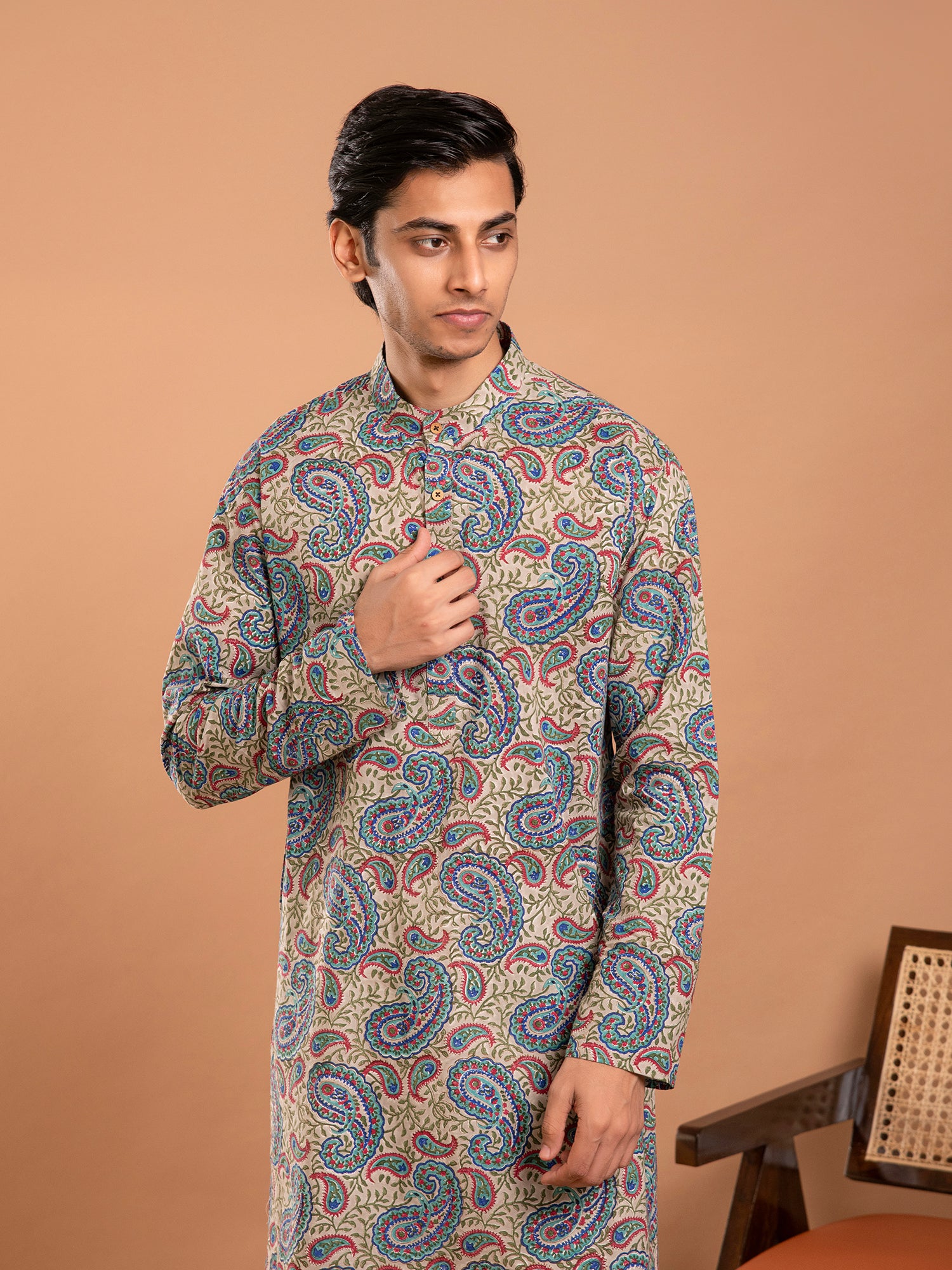 The "Aaheli Kairi Hand Block Printed Kurta-Pant Set" Crafted from high-quality fabric, this kurta features a captivating multicolored kairi block print that adds a touch of artistic flair and uniqueness and is a versatile outfit suitable for various occasions, from casual outings to festive events. It allows wearers to make a stylish statement with cultural flair and sophistication, thanks to its unique hand block-printed designs and traditional craftsmanship.