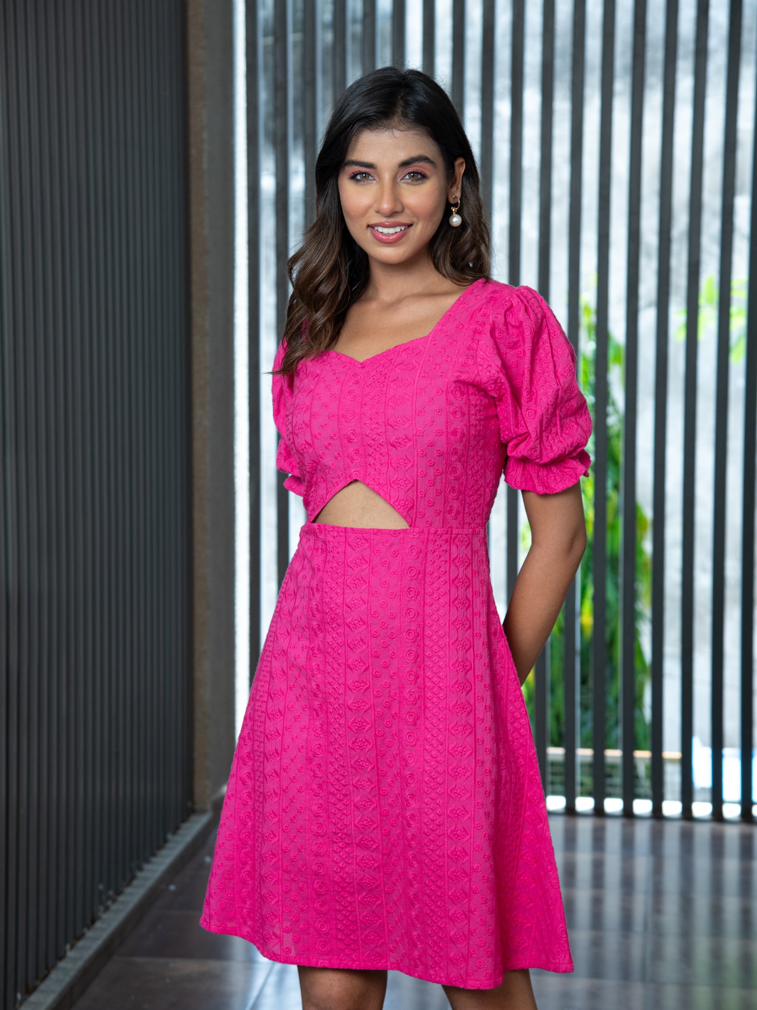 Stand out in this beautiful fuchsia pink dress that features intricate schiffli embroidery.