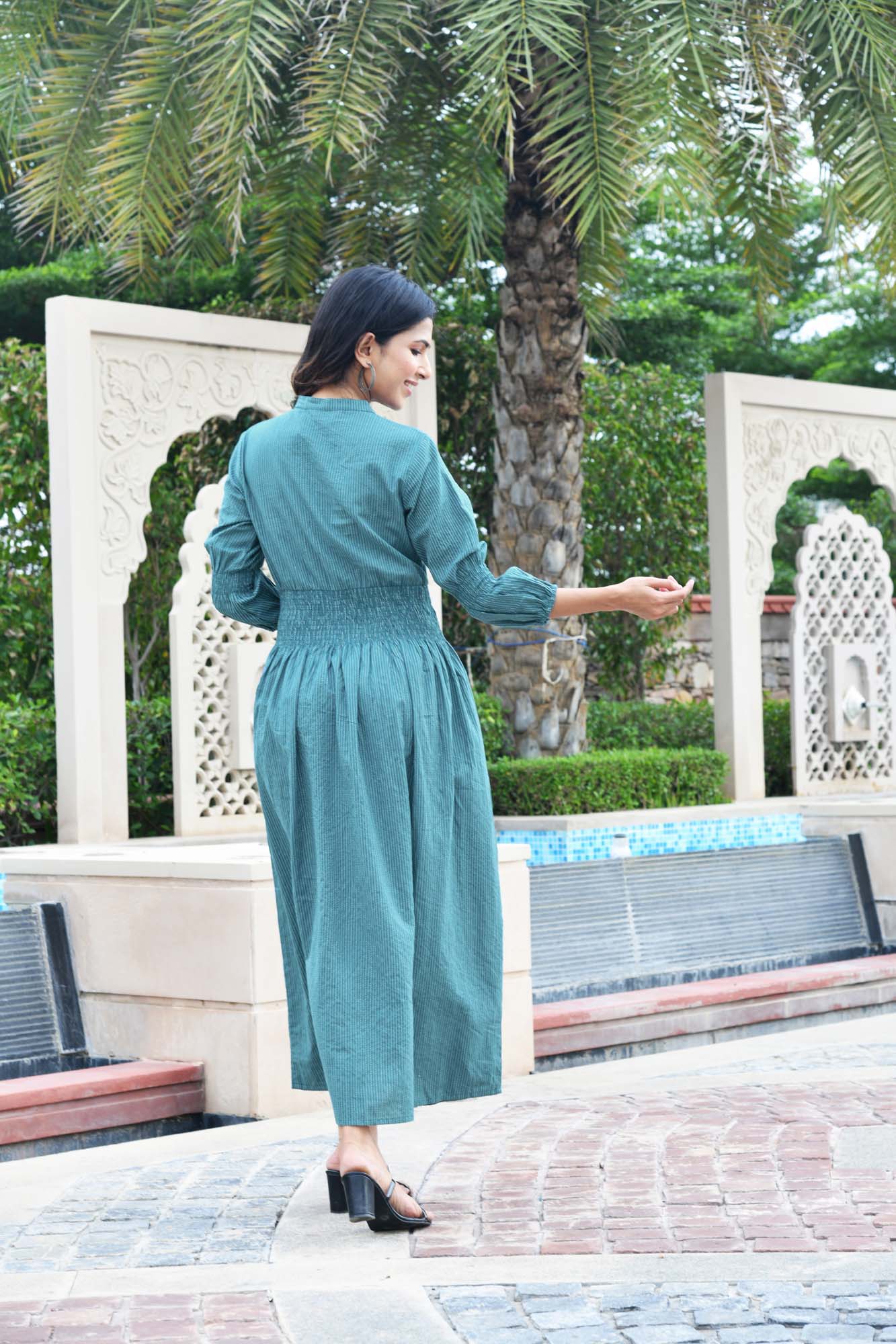 Teal cotton kantha dress features smocking on waist, front buttoned and v-neck with center smocking bishop sleeves. P.S this dress has pockets too ♡