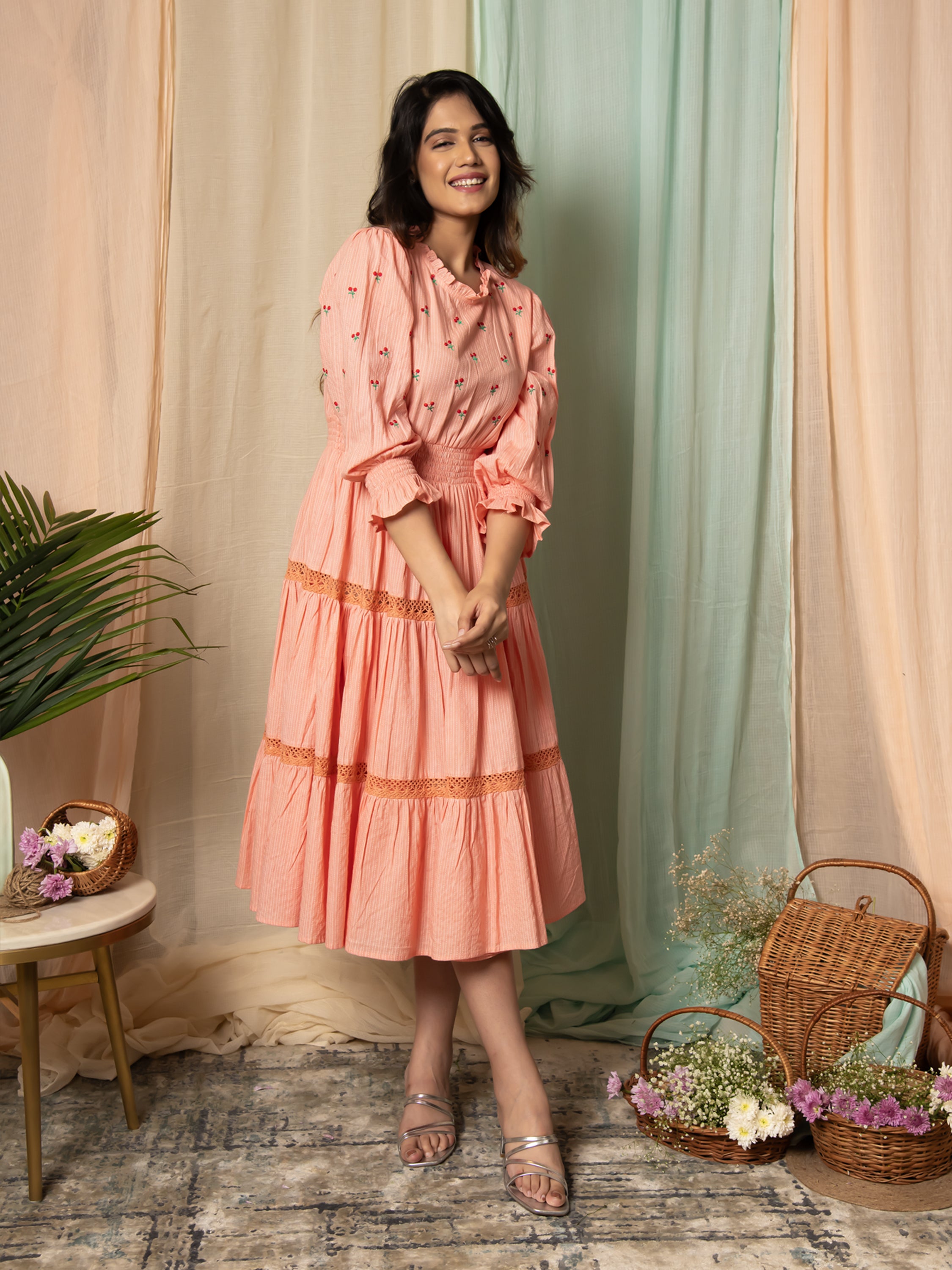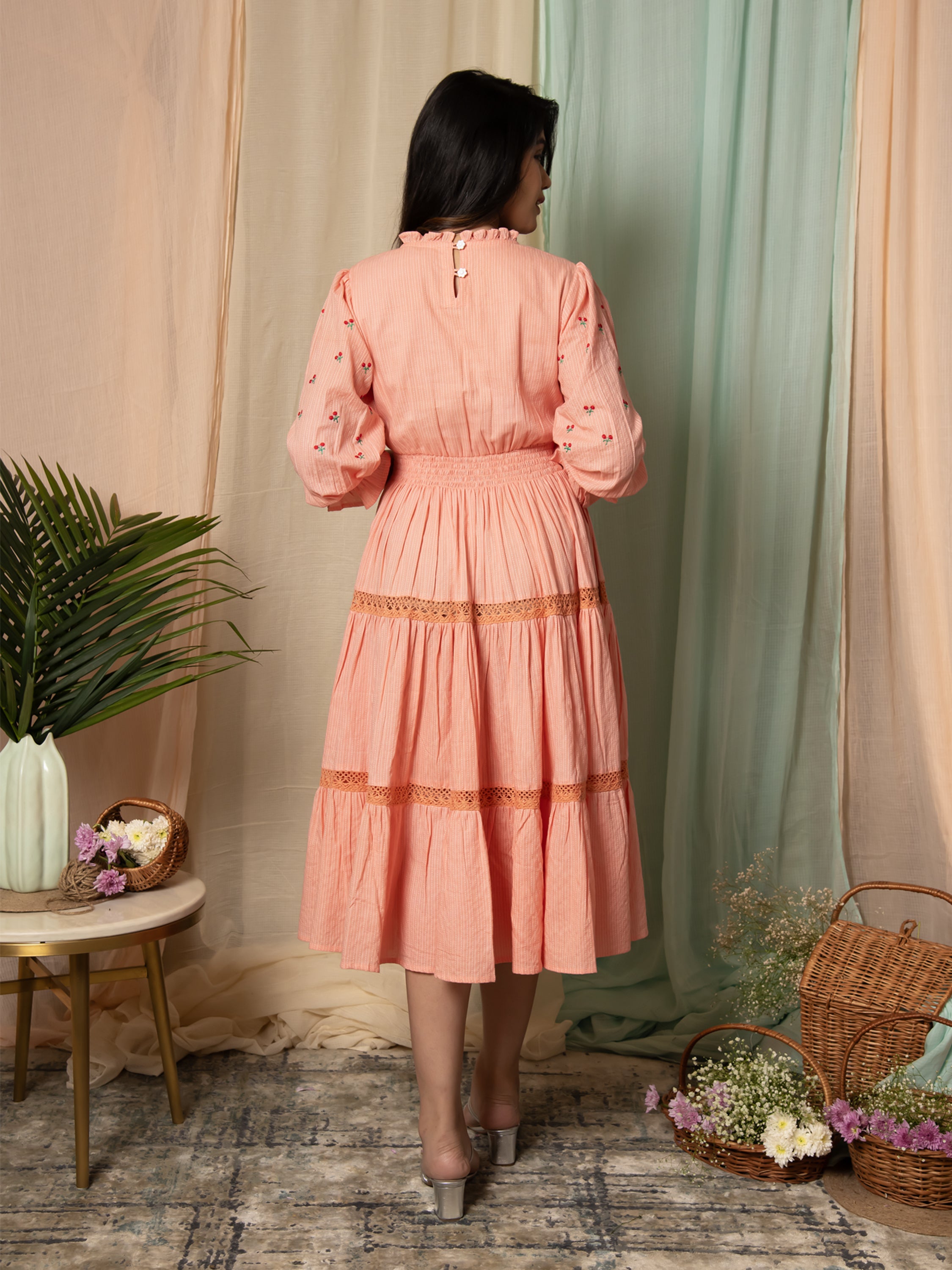 Introducing our Radiant Meadows Peach Cotton Kantha Tiered Dress. Embrace the warmth of the sun and let the gentle whispers of summer inspire your style.