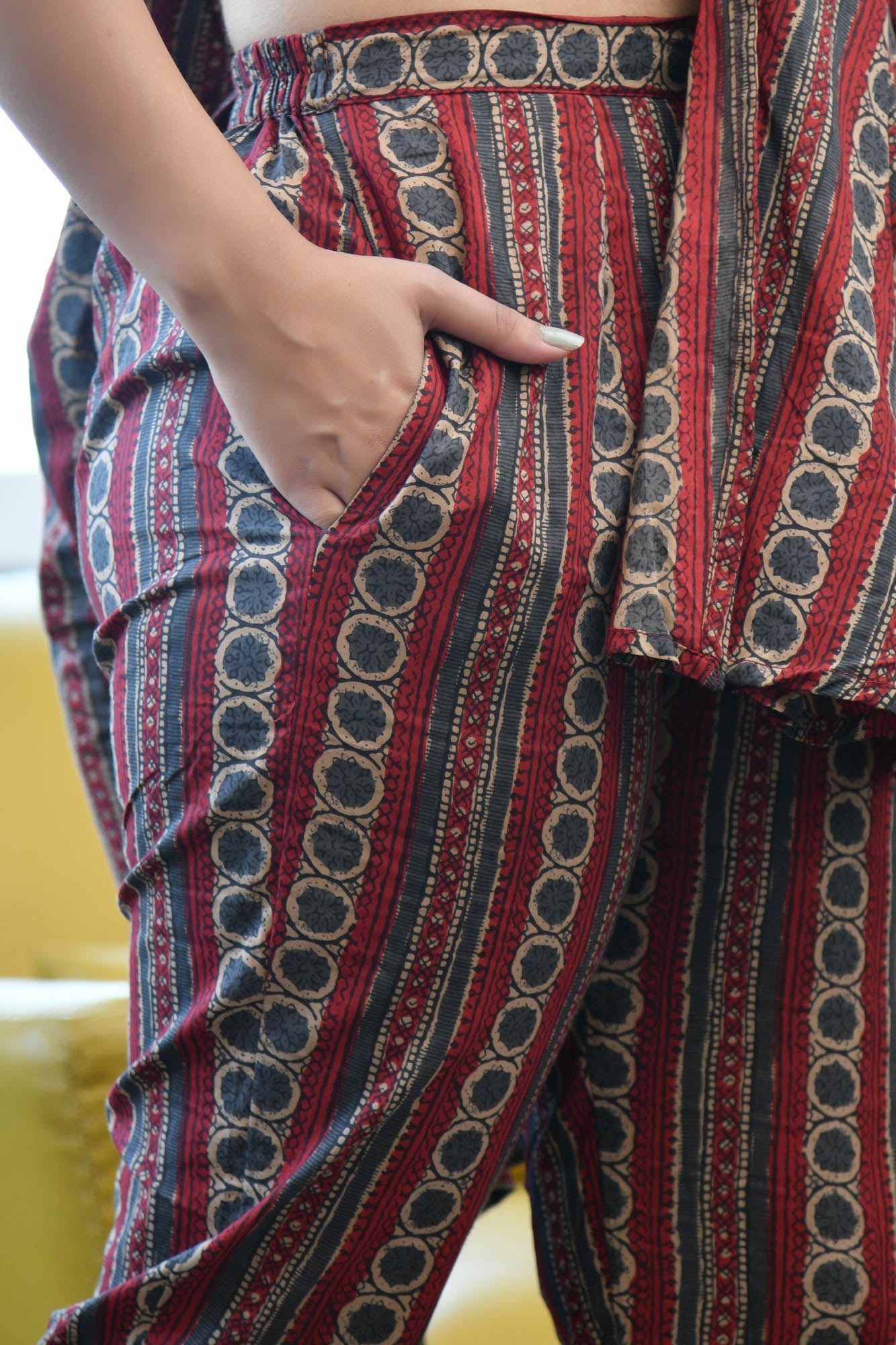 #BOSSBABE look in our Shanaya Maroon, grey & beige Printed cotton top-pants & blazer set.