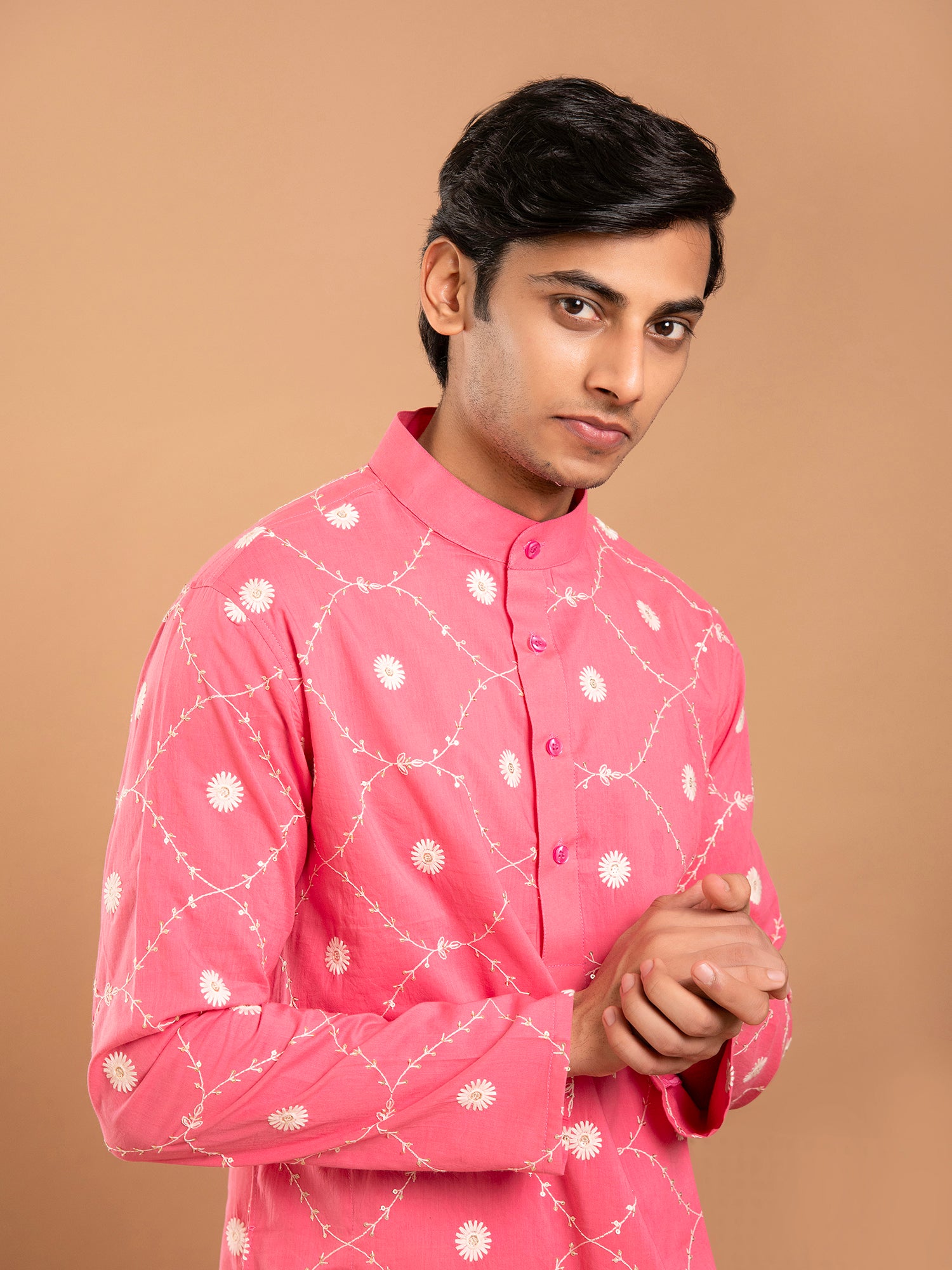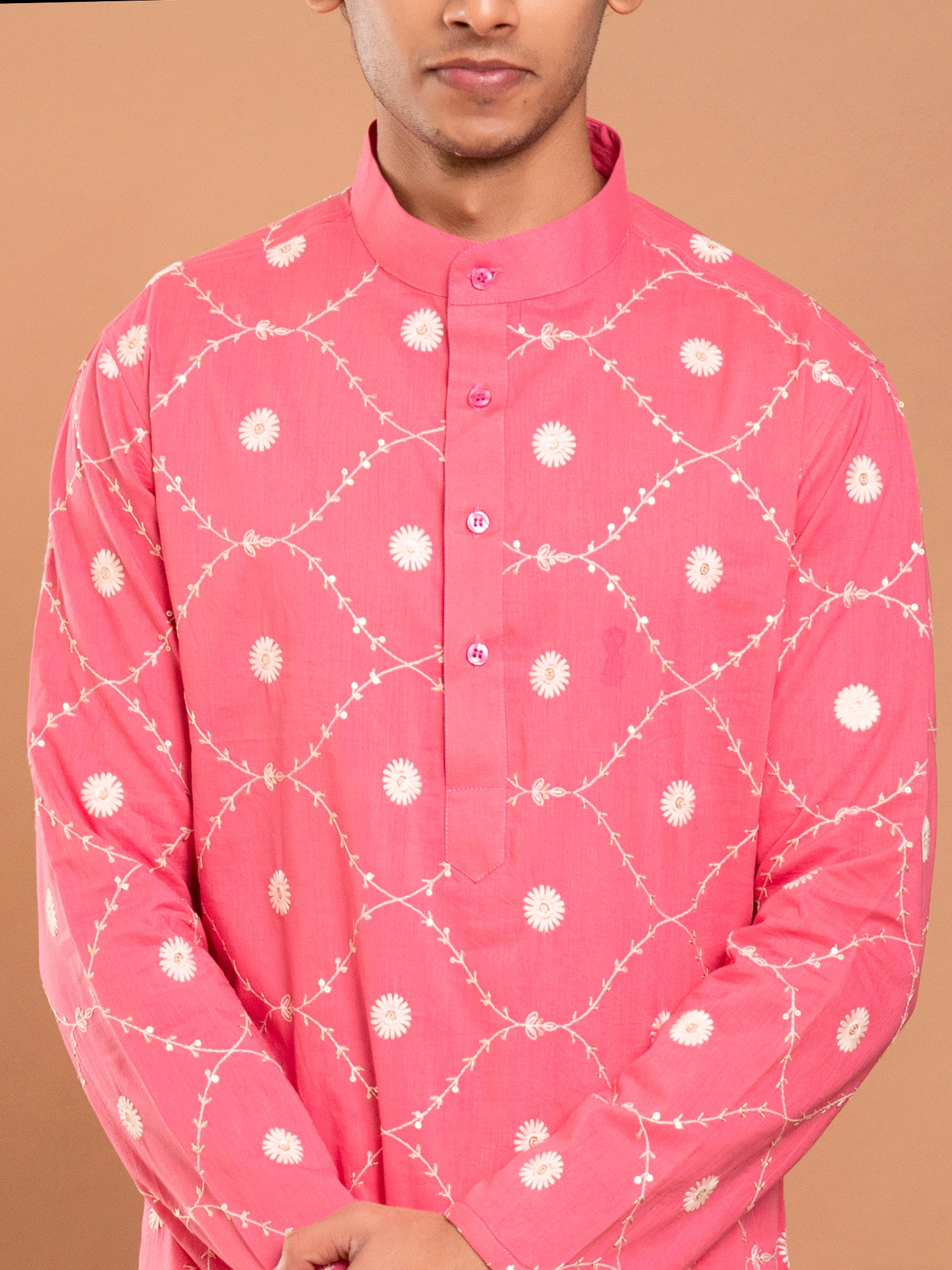 The Aaheli "Sharvil Pink Embroidered Kurta-Pant Set "combines a traditional craftsmanship with modern elegance, providing wearers with a comfortable and fashionable outfit option enriched with intricate embroidery details. It's suitable for various occasions, festive occasions, or semi-formal gatherings, allowing the wearer to make a stylish statement with elegance and grace.