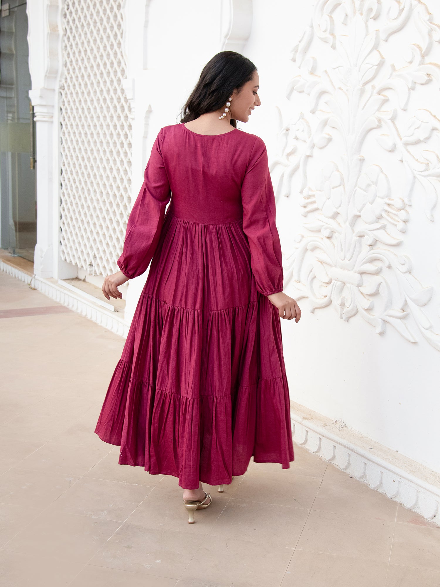 "Enchant in our Wine Plain Dyed Hand-Embroidery Tiered Maxi Dress with Bishop Sleeves. This captivating ensemble marries simplicity with sophistication, featuring exquisite hand embroidery that adds a touch of artistry. The tiered design adds a graceful flow, creating a flattering silhouette that moves with every step. The rich wine hue exudes elegance, making it a timeless choice for special occasions. Elevate your style with this enchanting maxi dress, where craftsmanship and design converge for a truly refined look."