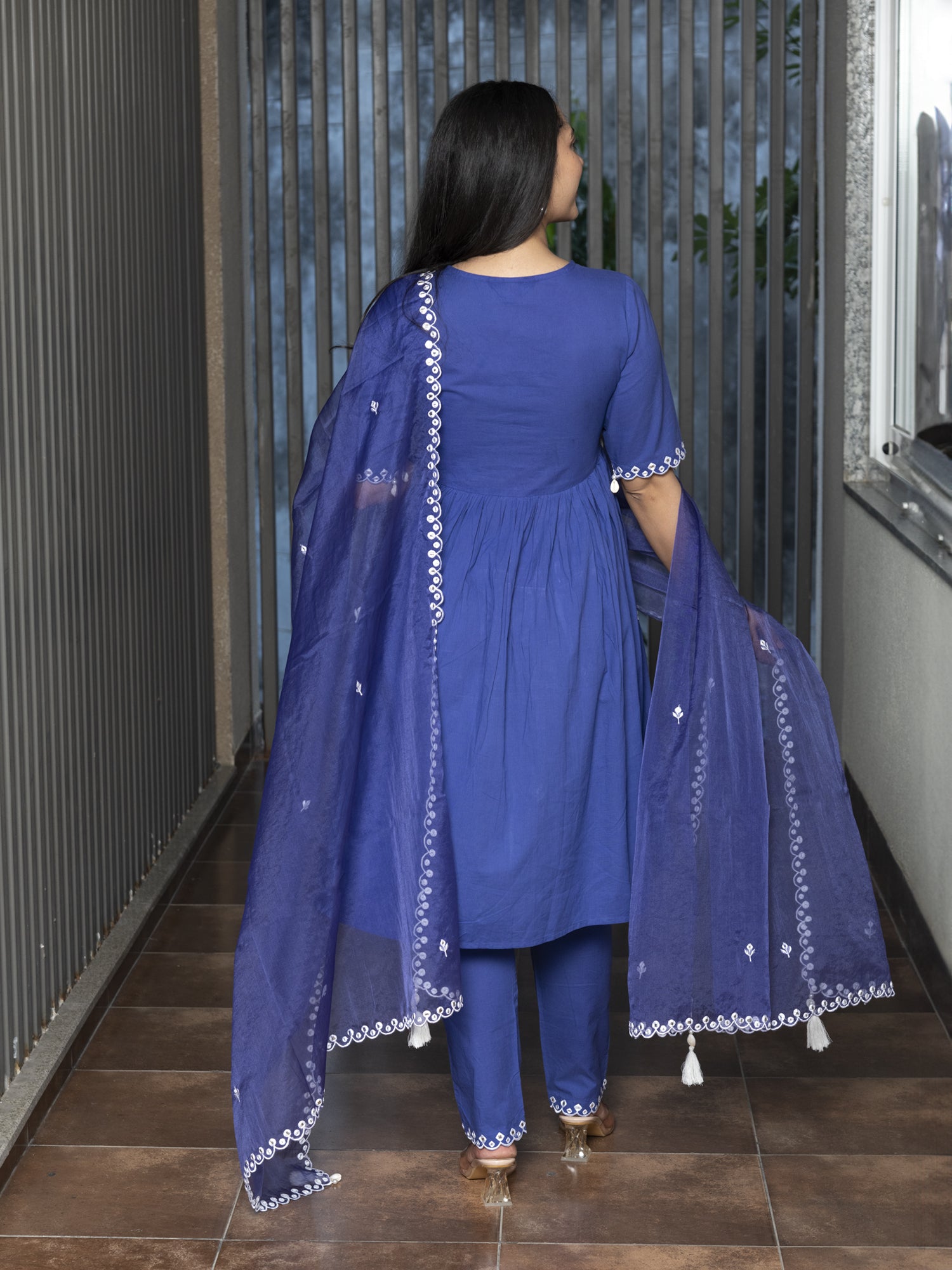 Introducing the 'TEERA SOLID-EMBROIDERED KURTA-PANT & DUPATTA SET,' a mesmerizing ensemble that embodies timeless grace. Cloaked in blue, adorned with resplendent white embroidery, gracing the neckline, yoke, sleeves, and bottom, this set is a symphony of artistry. Accompanied by matching pants, its allure is heightened with a matching organza dupatta featuring delicate white thread scalloped detailing, transporting you to a realm of refined sophistication.