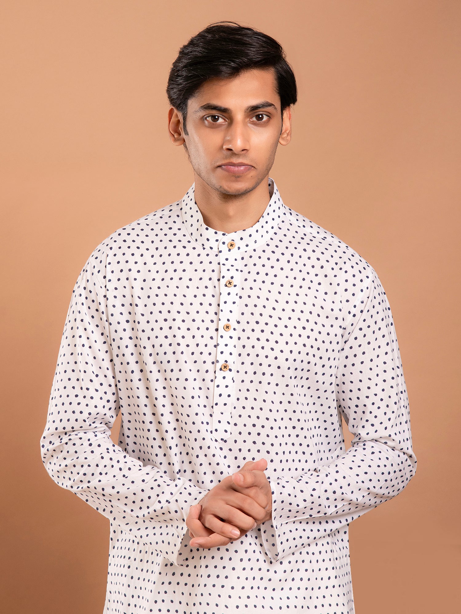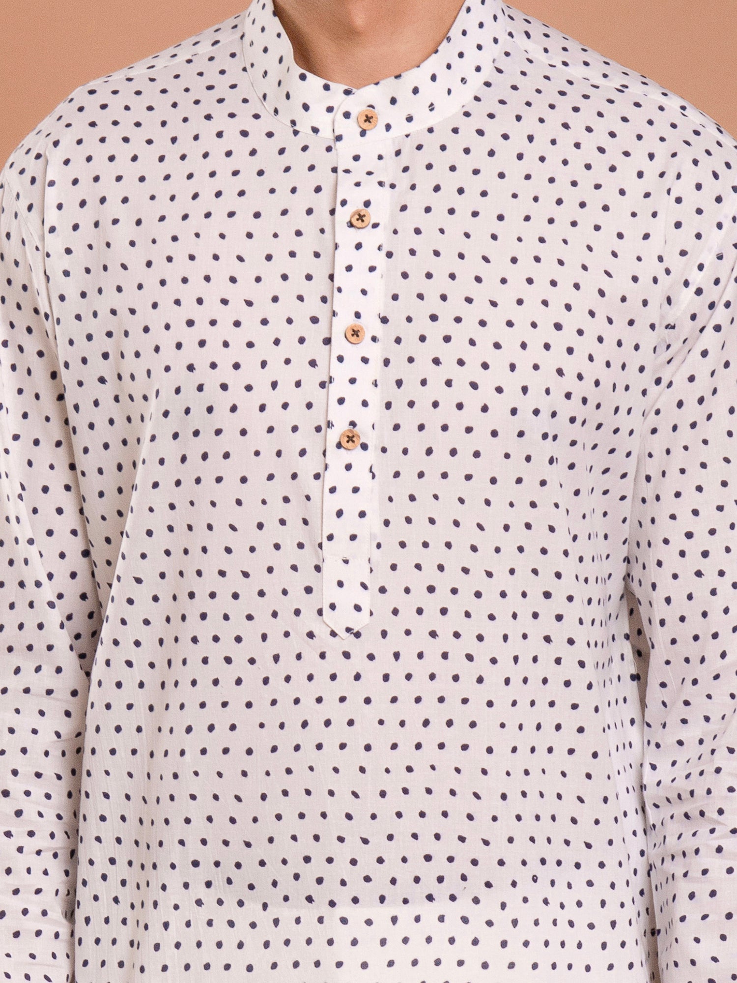 The "Aaheli White Polka Dots Hand Block Printed Kurta-Pant Set" suggests a charming and stylish ensemble with a playful twist. The color is described as white, providing a versatile base for the ensemble. The hand block printing technique is used to create polka dot patterns, which adds a whimsical and retro-inspired touch to the design making it suitable for various occasions, from casual outings to semi-formal gatherings.