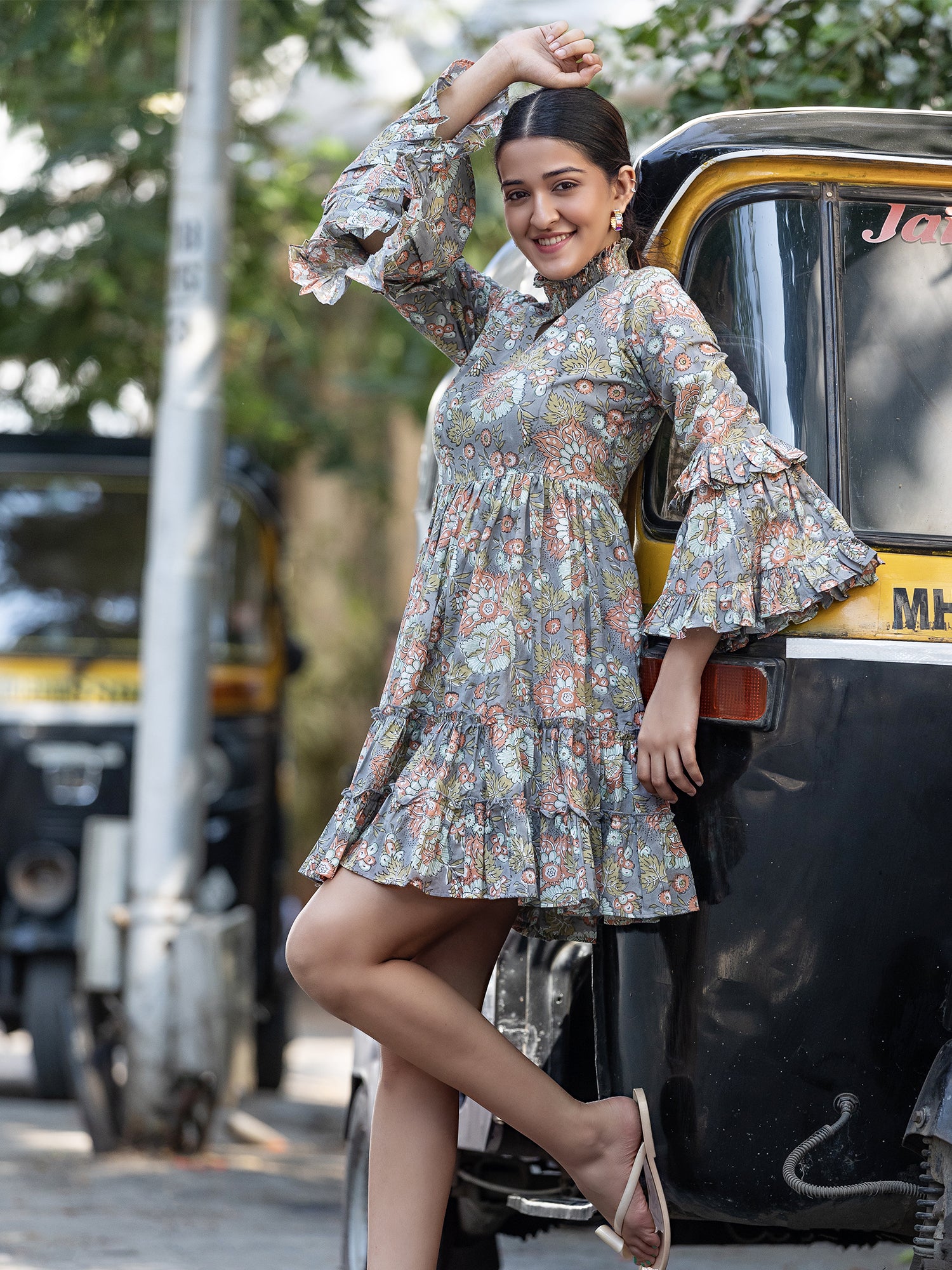 Crafted on a grey base with a floral multicolored block print, this tiered mini dress is a true celebration of nature's beauty. The crinkled smocking detailed neckline with a V-cutout adds a touch of bohemian charm, creating an alluring and unique look.