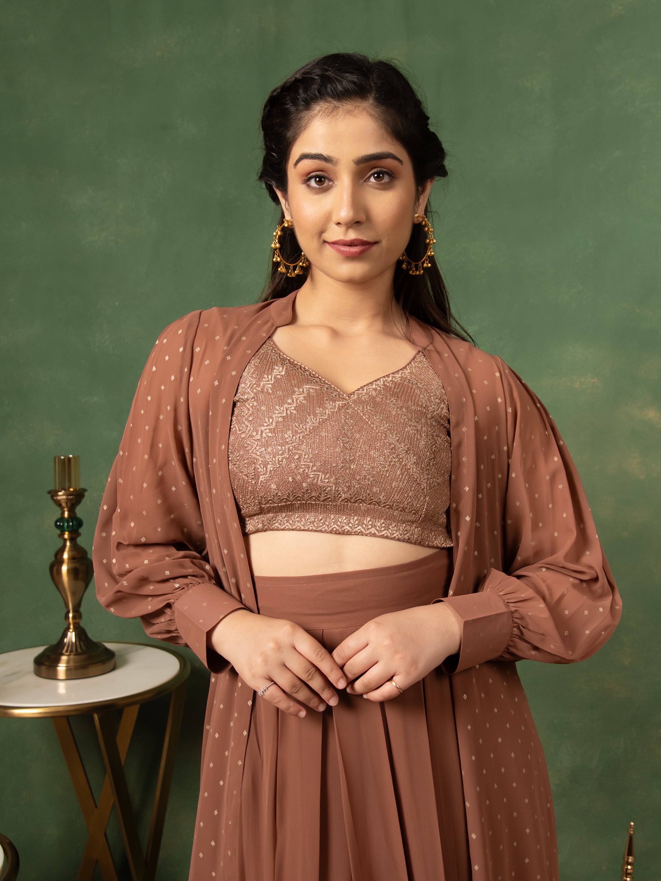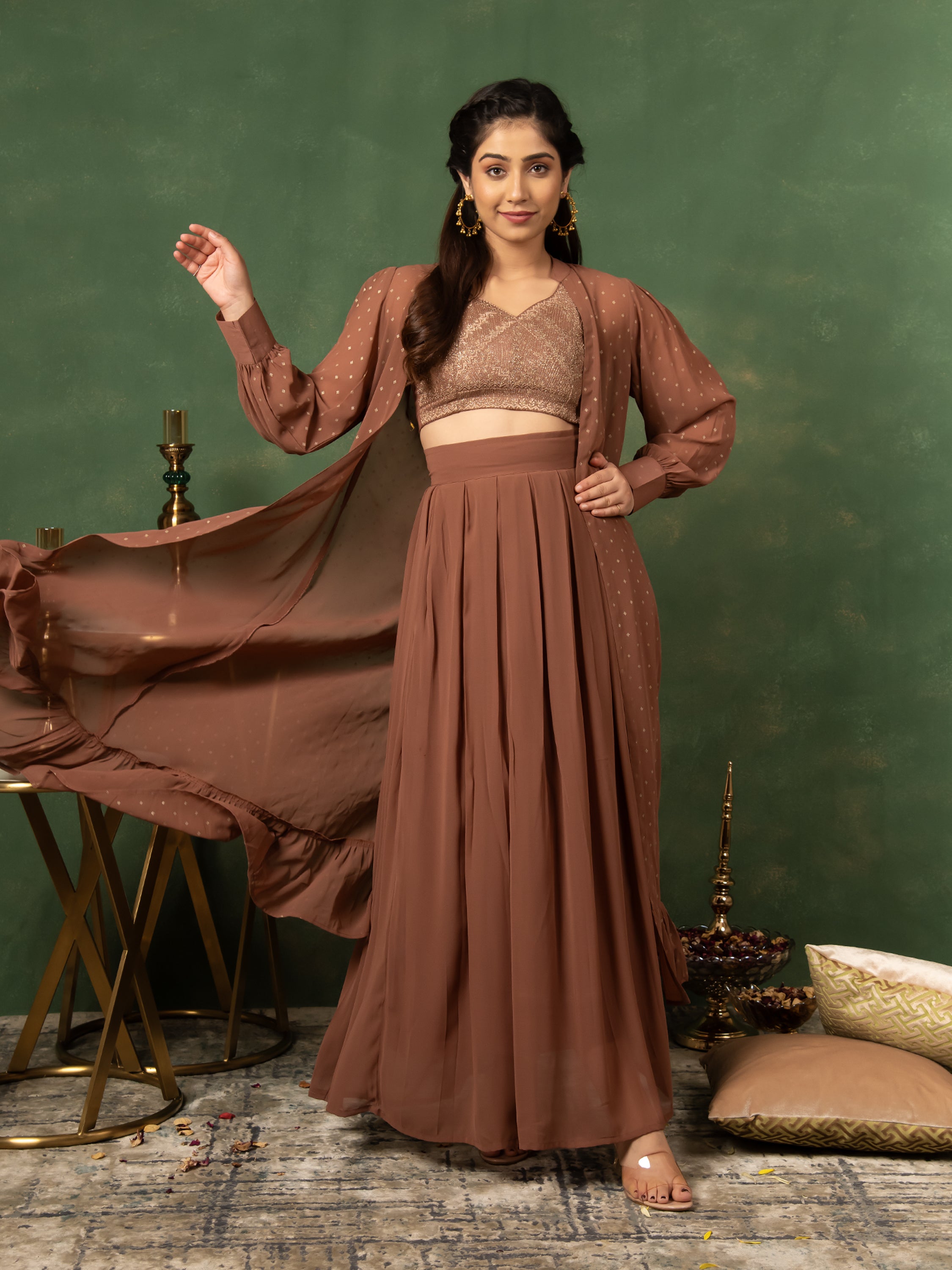 Introducing the MEERA BROWN RUST BLOUSE-SKIRT & COVERUP SET, a stunning rust-brown sleeveless embroidered blouse and georgette skirt set accompanied by a gorgeous shrug.