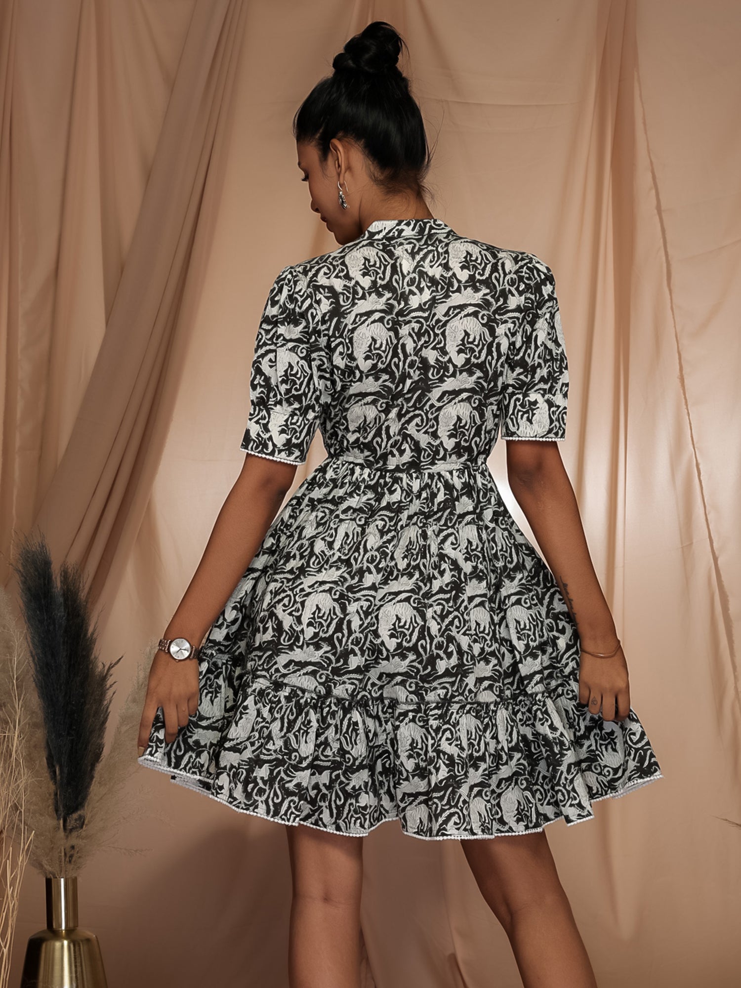Crafted from high-quality black fabric, this knee-length dress features a mesmerizing block print that adds depth and intrigue to its design. The half puffed sleeves with delicate lace detailing create a charming and feminine look, exuding a touch of romantic sophistication.