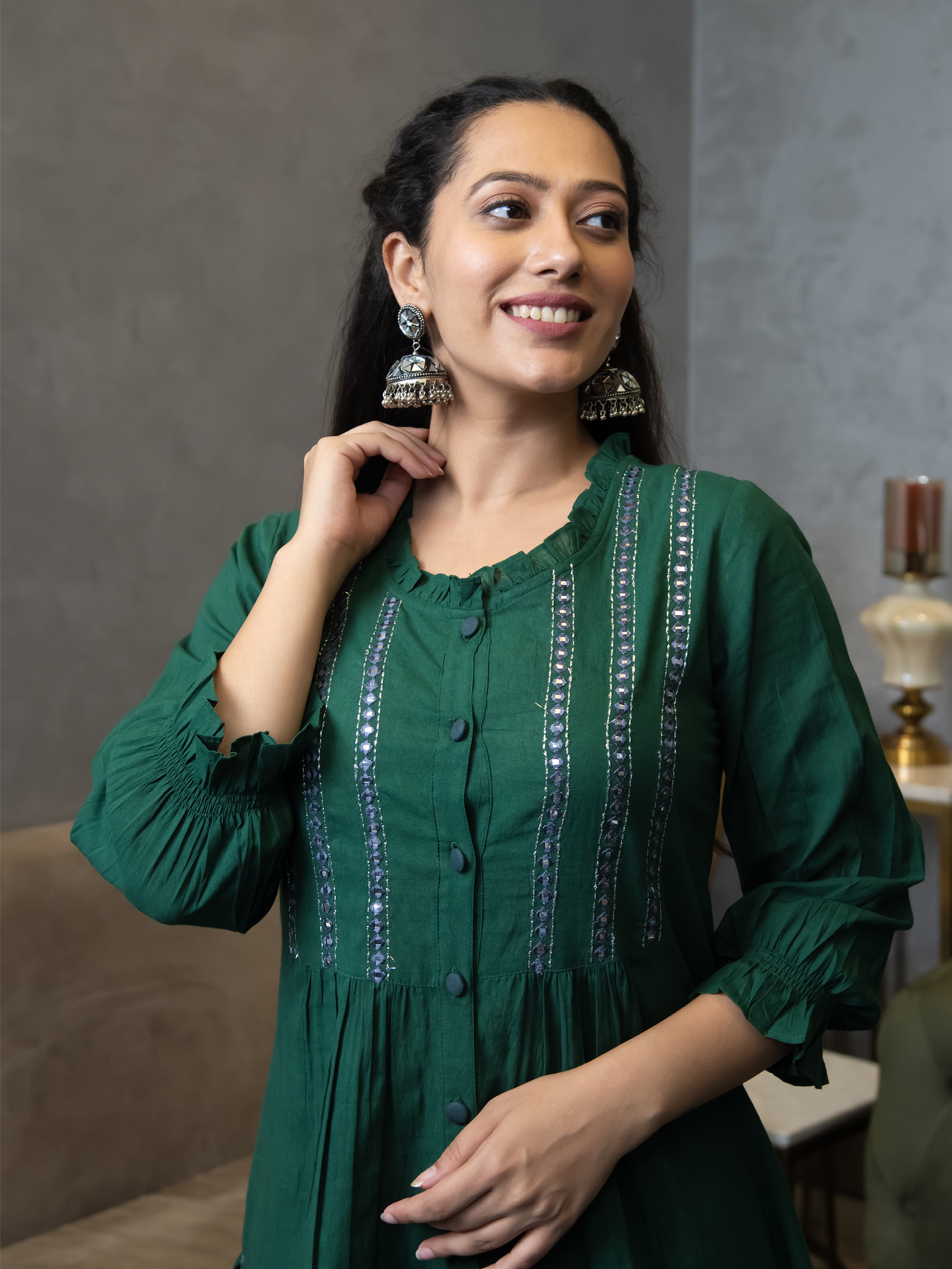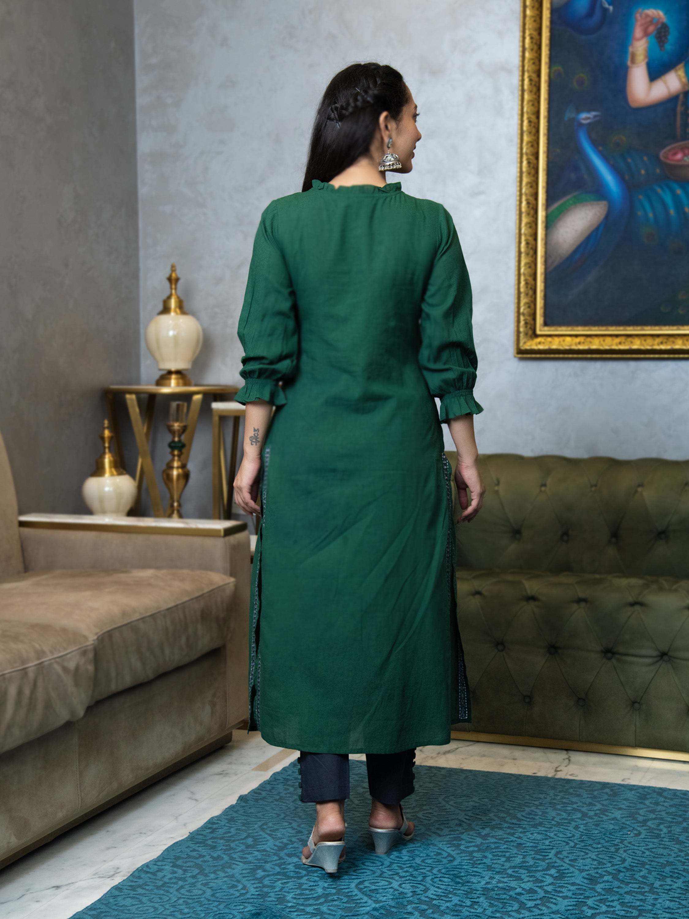Embrace the grace of the 'AAVI DEEP GREEN KURTA & PANTS SET,' a tribute to timeless beauty. The bottle green side-slitted kurta boasts intricate gathers on the front, exuding an enchanting aura. Its placket closure, adorned with machine mirror embroidery, adds a touch of opulence. The round neckline is adorned with delicate frills, adding a dash of playfulness. Paired with matching pants, this ensemble encapsulates the essence of modern Indian charm.