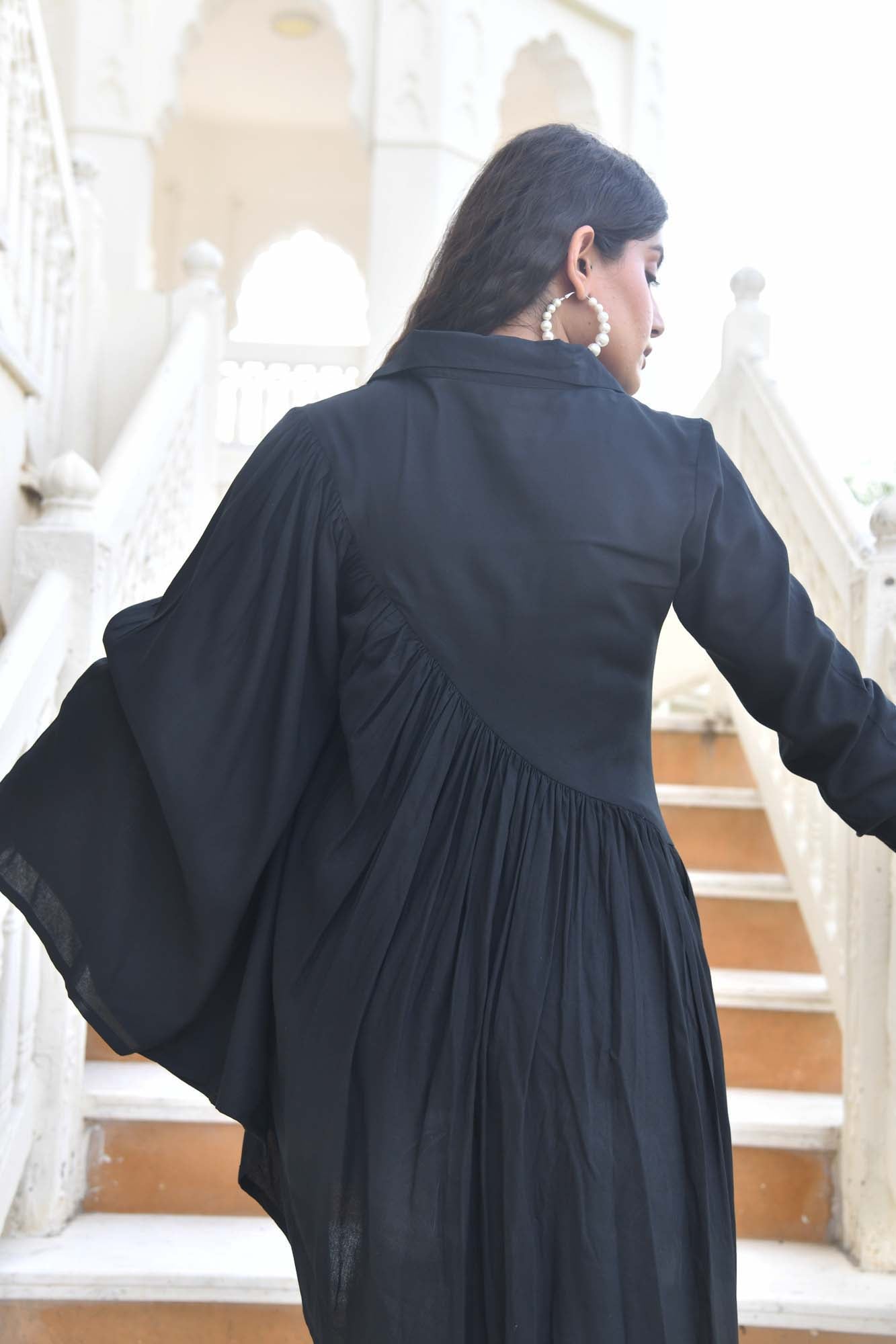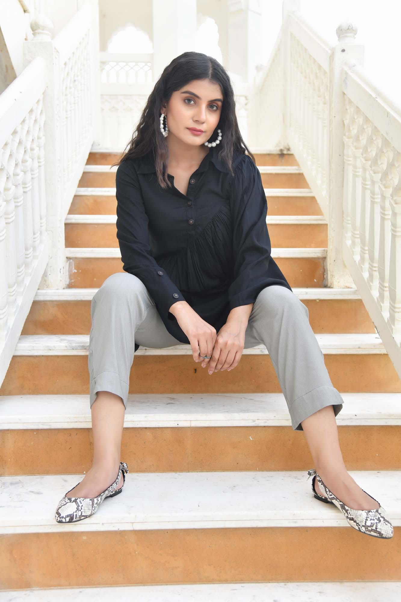 Black rayon shirt with a twist of diagonal gathered detailing paired with grey rayon straight pants with pockets.