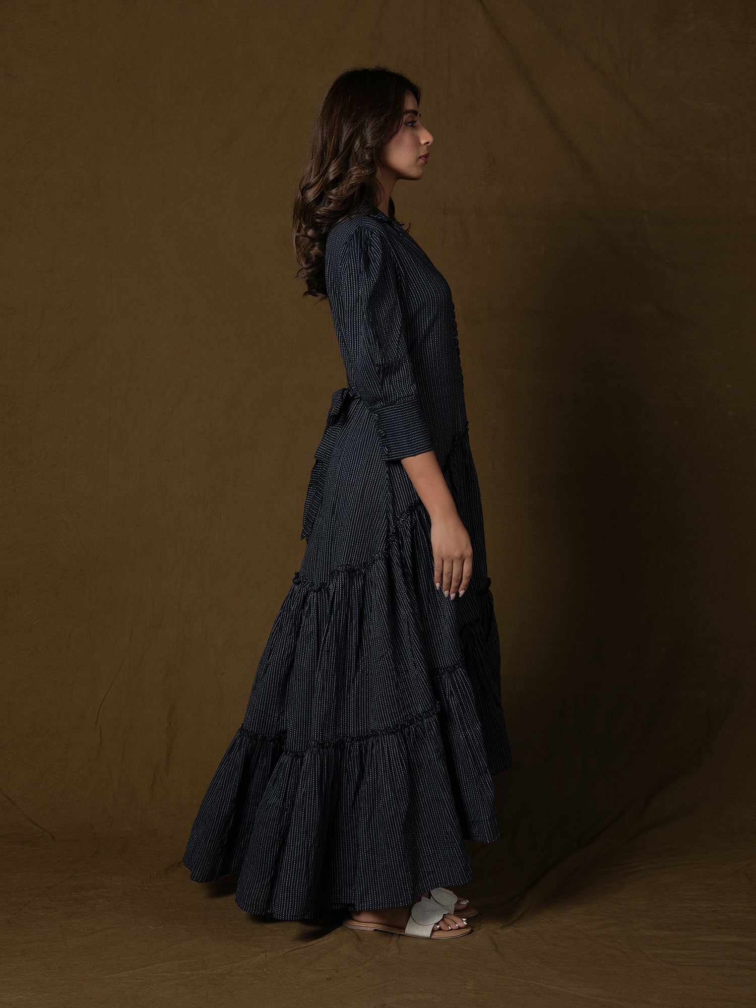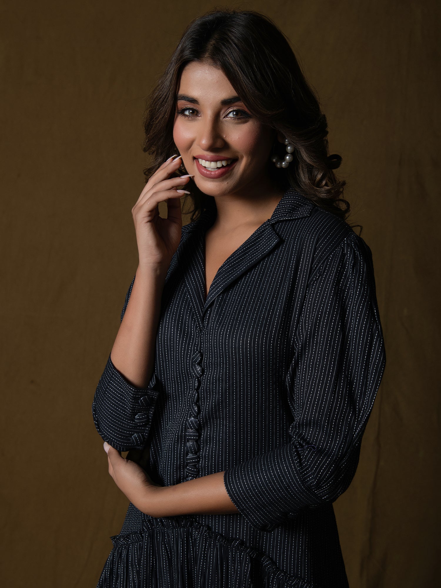 Be Ready to flaunt in our MIDNIGHT BLACK COTTON KANTHA TIERED DRESS. This dress is handcrafted in pink cotton kantha featuring buttons on front and tiers on bottom.