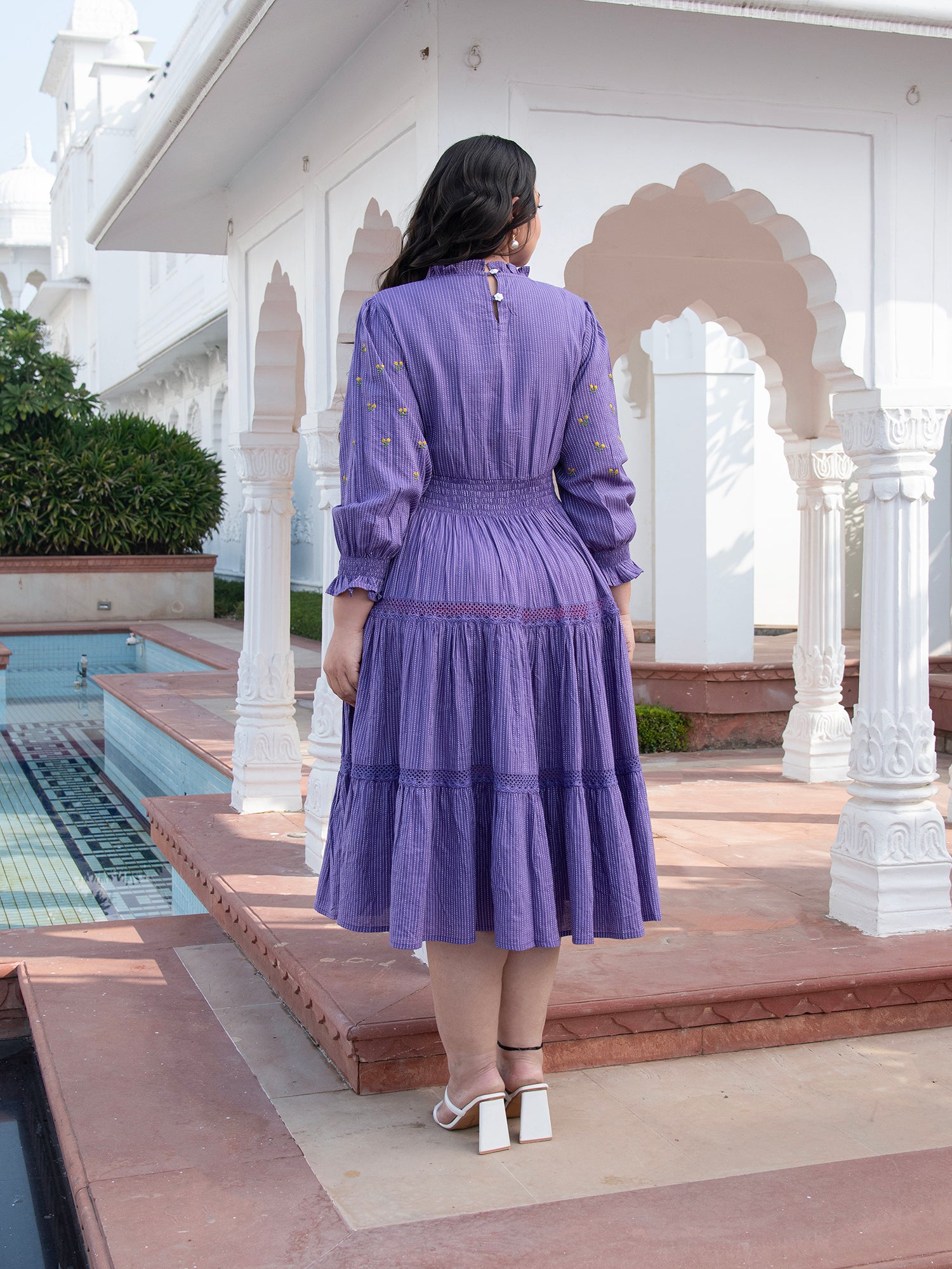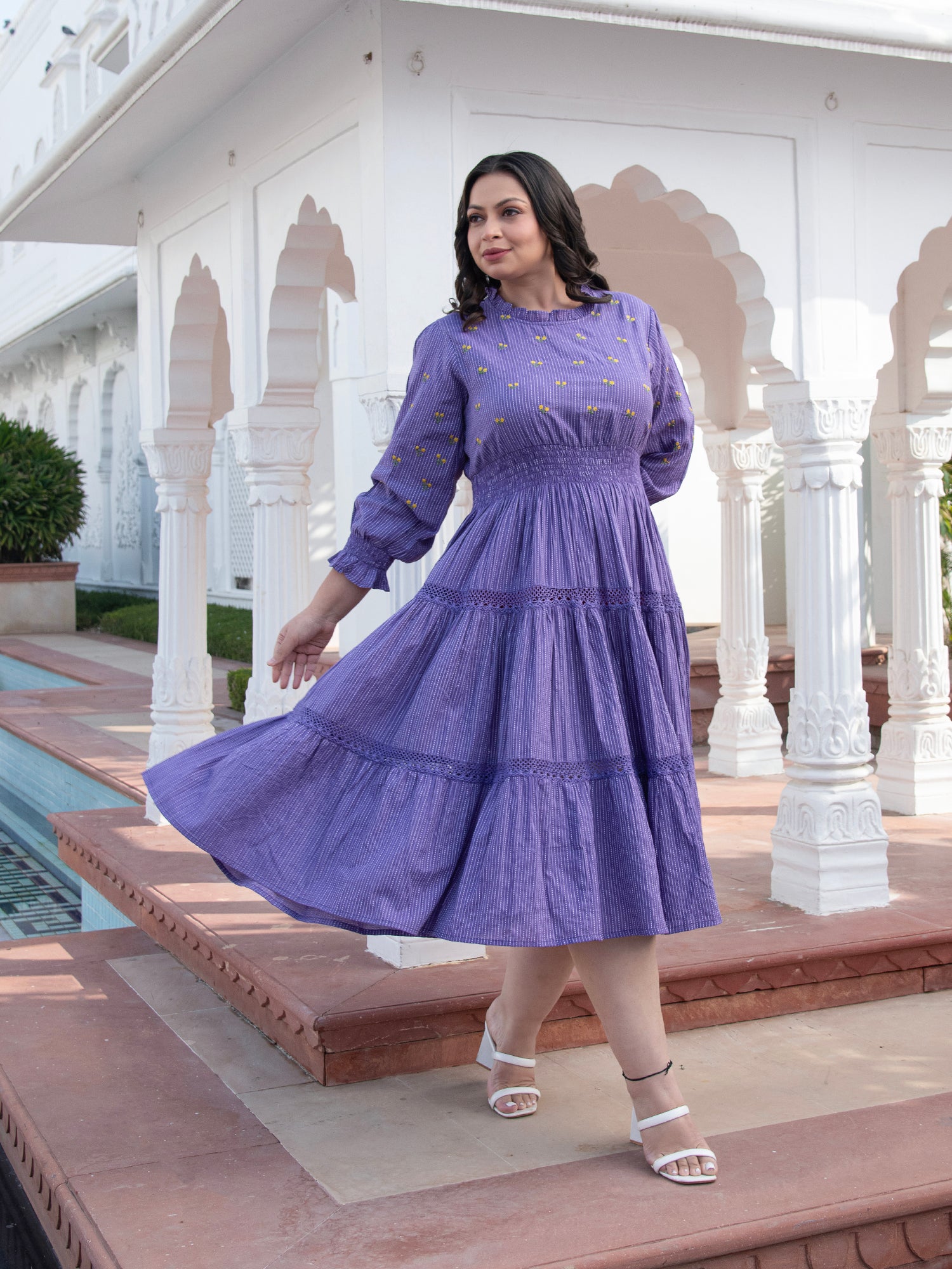 Introducing our Radiant Meadows Purple Cotton Kantha Tiered Dress. Embrace the warmth of the sun and let the gentle whispers of summer inspire your style.